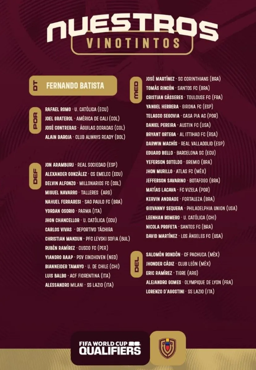 La Selección de Venezuela convocó a 41 jugadores para la doble fecha de eliminatorias mundialistas, en la que la Vinotinto se medirá frente a Bolivia y Uruguay. El técnico Fernando Batista no descartó la posibilidad de conformar dos equipos para afrontar esos partidos.