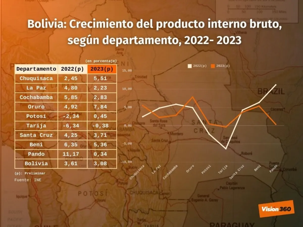 Cochabamba, por su lado, redujo su crecimiento de 5,85% a 2,83% entre 2022 y 2023, mientras que Chuquisaca mejoró su actividad económica y se expandió en 5,51% el año pasado, tasa superior a la de 2,45% alcanzada en 2022.