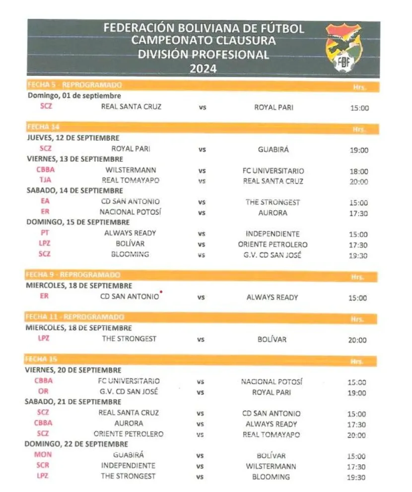 Por otra parte, se confirmó que el encuentro entre Real Santa Cruz vs. Royal Pari, correspondiente a la quinta jornada del Torneo Clausura, se disputará el domingo 1 de septiembre desde las 15.00 en el estadio del primero.