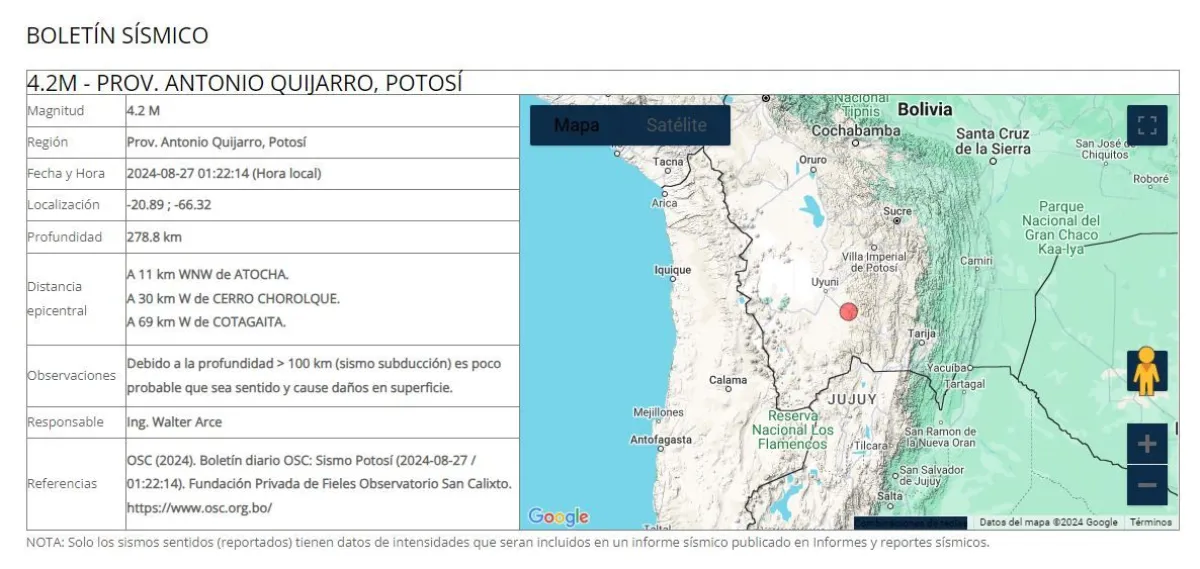 El Observatorio de San Calixto reportó este martes un sismo de 4,2 grados en la escala de Richter, en Potosí, el cual se registró en la madrugada en la provincia Antonio Quijarro de ese departamento.