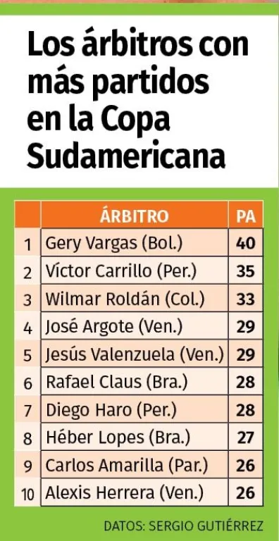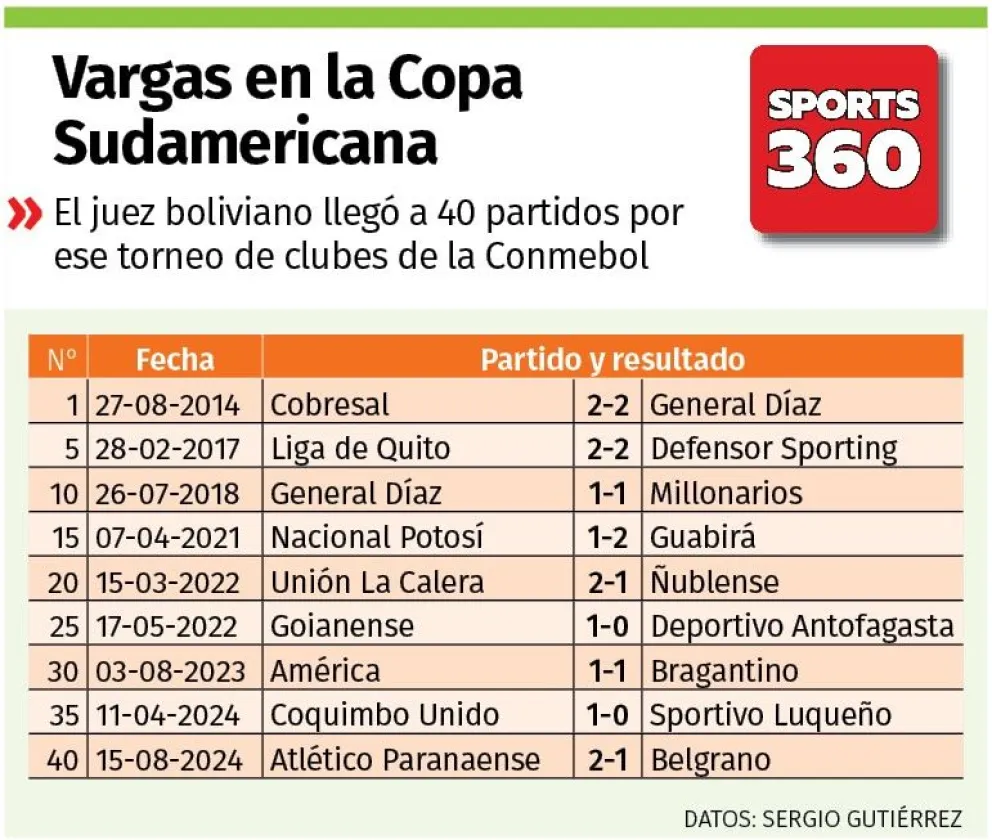 Con el partido entre el brasileño Atlético Paranaense y el argentino Belgrano, por la ida de los octavos de final de la Copa Sudamericana, el árbitro boliviano Gery Vargas suma 40 partidos de ese torneo de la Conmebol y es el juez con más partidos en el certamen de la Conmebol, según los datos de Sergio Gutiérrez, estadístico boliviano que reside en Brasil.