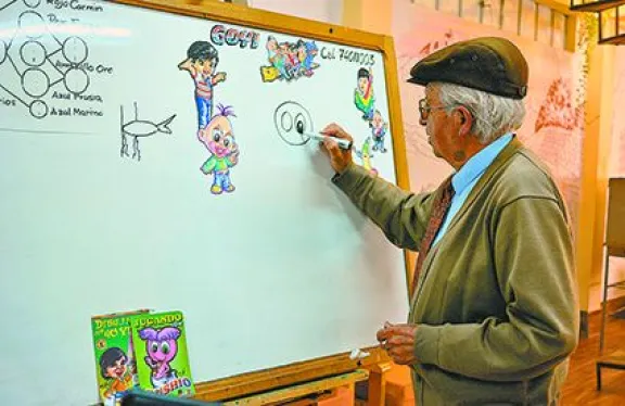 Con el pulso firme, el profesor Jaime Sanjinés Vidal acerca el marcador a la pizarra blanca. “Hay que trabajar en grande, para poder añadir detalles como los ojos”, explica al tiempo que dibuja la cara de su hijo más famoso, Goyi, en uno de los videos de su canal de Tik Tok. A los 83 años, el pionero de los suplementos educativos de la prensa nacional continúa enseñando a la mayor cantidad posible de niños.