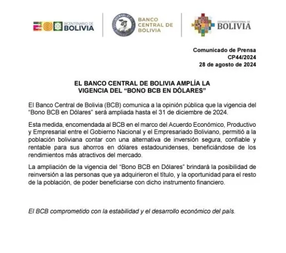 El Banco Central de Bolivia (BCB) informó este miércoles que la vigencia del Bono BCB en Dólares se amplió hasta el 31 de diciembre, por lo que la población que no lo hizo aún tiene la oportunidad de acceder a este instrumento financiero.