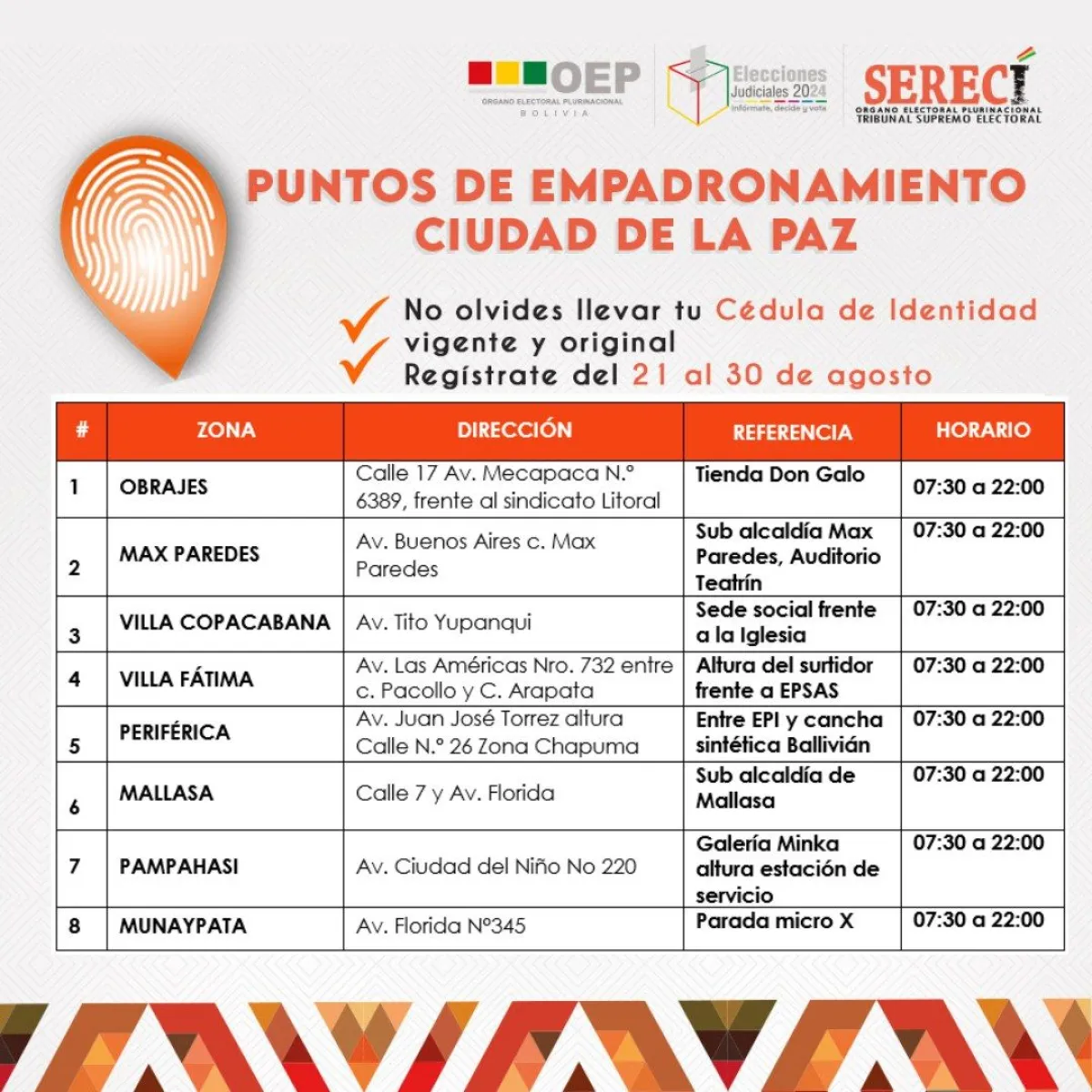 El Servicio de Registro Cívico (Serecí) aseguró este miércoles que no se ampliará el plazo para el empadronamiento electoral, que culmina el 30 de agosto, pese a la gran afluencia de personas y algunos problemas que demoraron la atención.