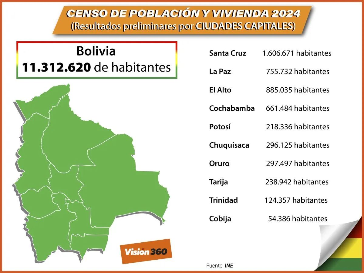 La ciudad de Santa Cruz de la Sierra es la más habitada de las urbes capitales, con 1,6 millones de habitantes, según los resultados preliminares del Censo 2024. Le sigue la ciudad de El Alto con una población de más de 800 mil personas.