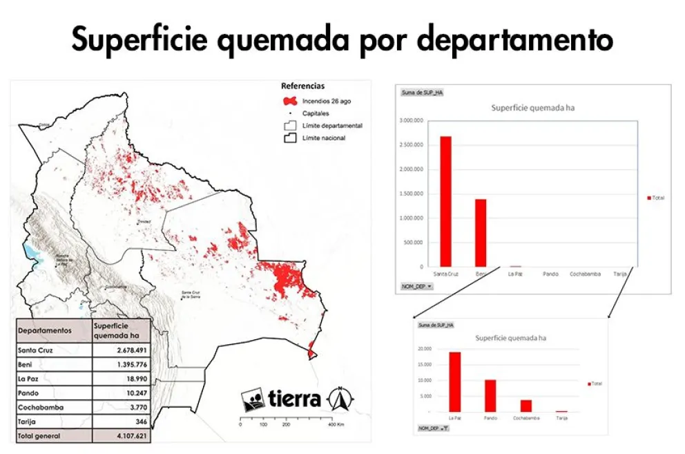 Según Efraín Tinta, investigador de esta fundación, los departamentos más perjudicados son Santa Cruz con 2,6 millones de hectáreas, Beni con 1,3 millones de hectáreas y La Paz con 18.990 hectáreas.