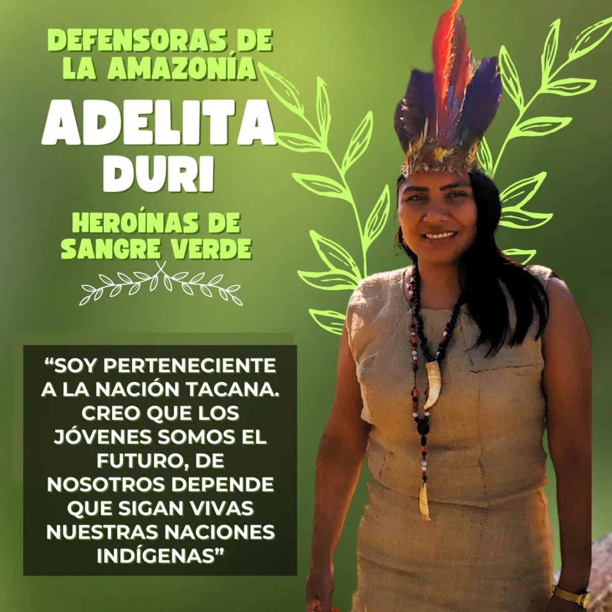 Ella califica a la Amazonía como la casa grande donde reside su Nación Tacana; entonces su misión es defender su hogar de la tala y la deforestación; principalmente de la minería ilegal.