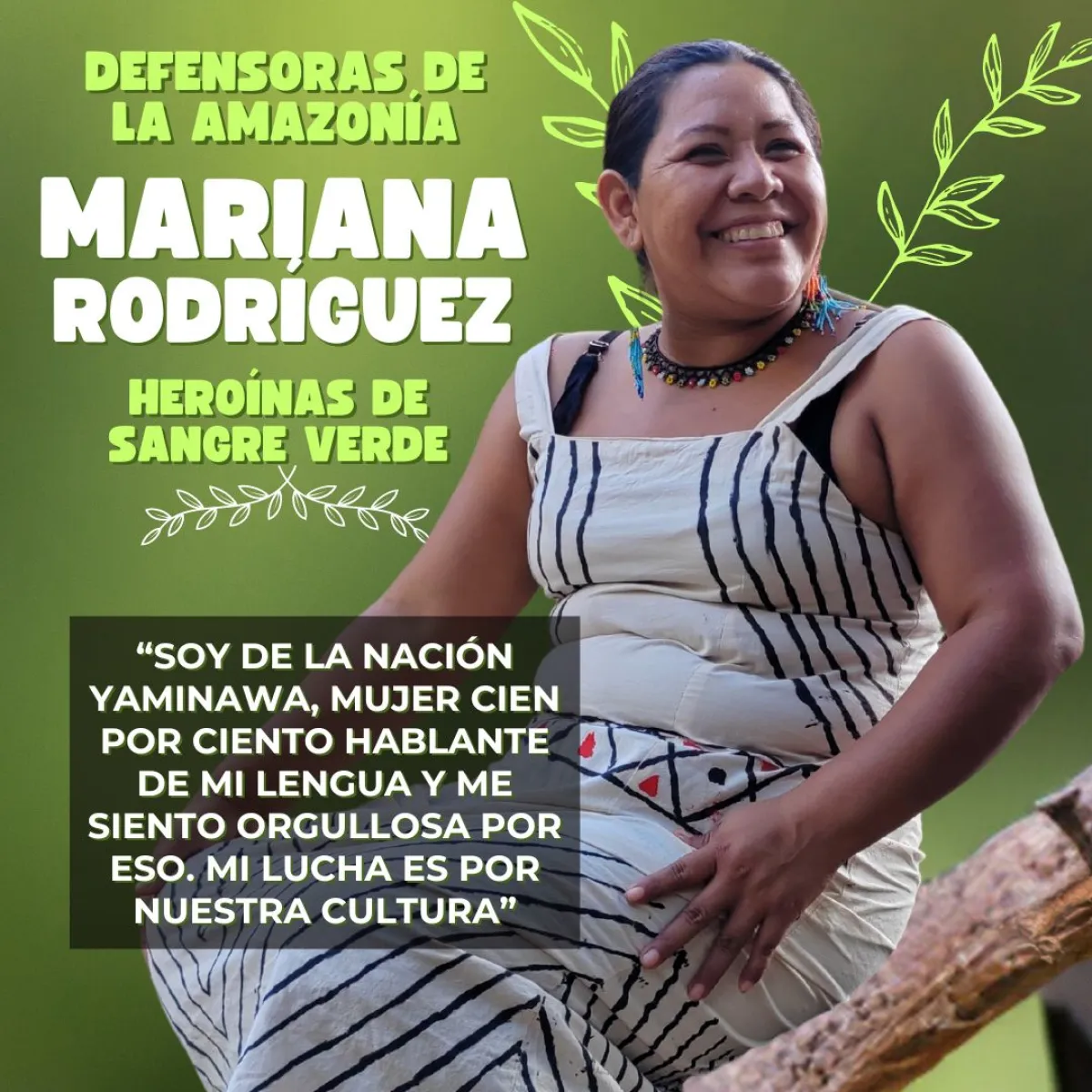 No hay peor muerte que el olvido y Mariana Rodríguez González lo sabe. Cada día lucha por recordarles a los jóvenes de su comunidad que la palabra “sol” en lengua Yaminawa tiene cuatro letras, “fari”. Para decir “buen día” se usan 13 letras en dos palabras: “fenamari shara”… mientras que “buenas noches” se escribe “yabe shara”. Esta hábil artesana teje su lucha a favor a la Amazonía desde la palabra.