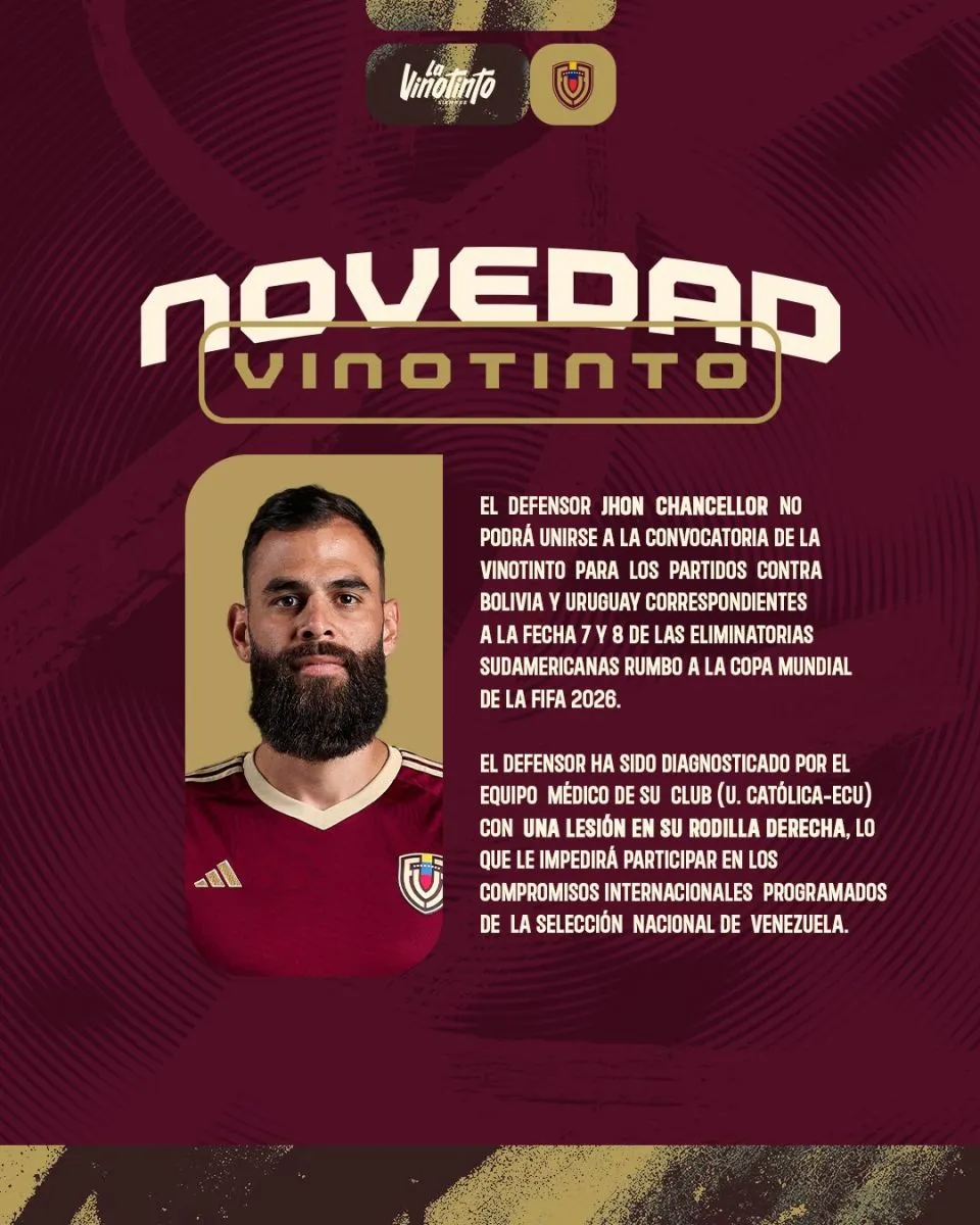 "El defensor Jhon Chancellor no podrá unirse a la convocatoria de la Vinotinto para los partidos contra Bolivia y Uruguay, correspondientes a las fecha 7 y 8 de las eliminatorias sudamericanas rumbo a la Copa Mundial de la Fifa 2026", señaló la FVF en un mensaje publicado en X.
