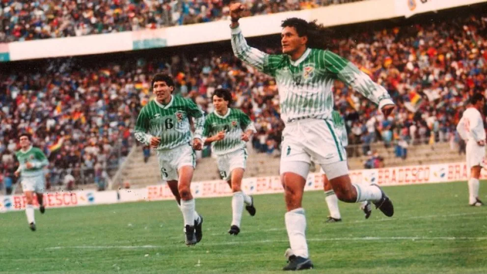 Etcheverry festeja uno de los dos goles que le hizo a la vinotinto en 1993. Foto: Historia del Fútbol Boliviano.