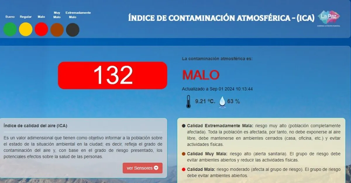 En el día del peatón la ciudad de La Paz registró 132% en la escala del Índice de Contaminación Atmosférica (ICA), que se cataloga como “mala”, según información del Gobierno Autónomo Municipal de La Paz. El cielo presenta una densa capa que aparente un día nublado, pero se trata del humo que proviene de incendios en otras regiones.