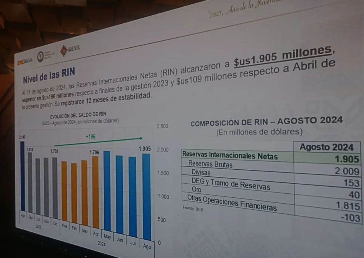 Las Reservas Internacionales Netas (RIN), en el Banco Central de Bolivia (BCB), subieron y alcanzan los 1905 millones de dólares, lo que representa 196 millones más que en el cierre de 2023. Del total, 153 millones son divisas, 1.815 millones oro y 40 millones DEG (Derechos especiales de giro) y otros.