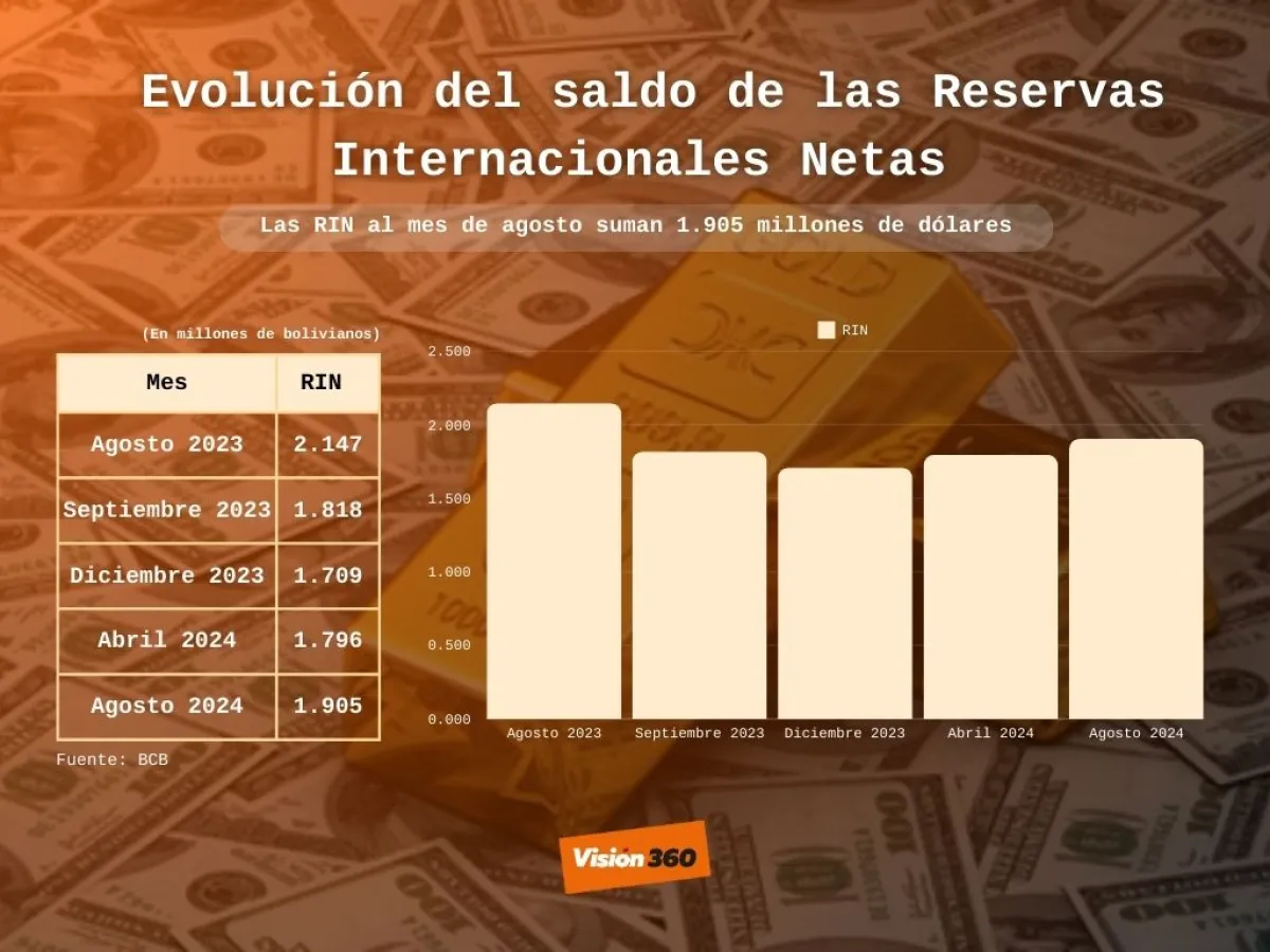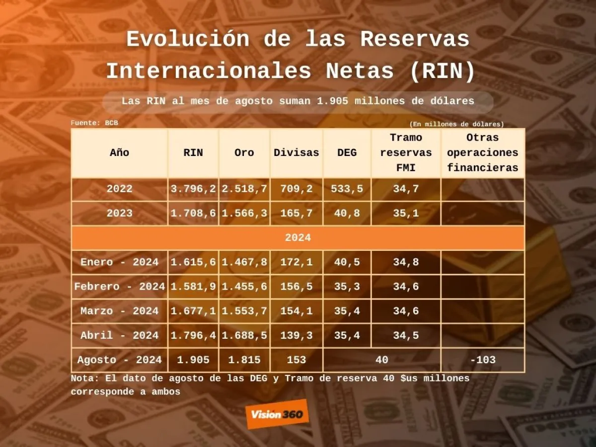 Las compras de oro y su elevada cotización internacional fortalecieron las Reservas Internacionales Netas (RIN), que al mes de agosto suman 1.905 millones de dólares, respecto a diciembre de 2023. Aquello representa un incremento de 196 millones de dólares respecto a diciembre de 2023, informó el Banco Central de Bolivia (BCB).