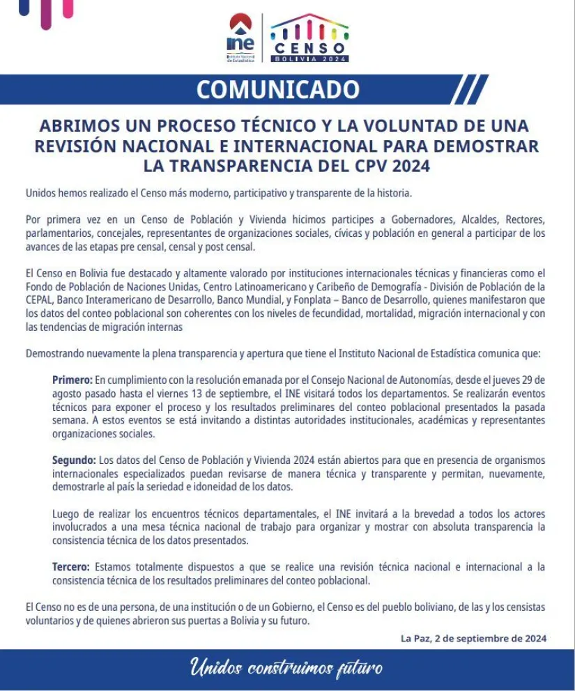La postura de la entidad estadística estatal se da en medio de varios pedidos de auditoría al proceso censal, cuyos datos fueron presentados el pasado jueves y establecen que en Bolivia hay 11.312.620 habitantes.