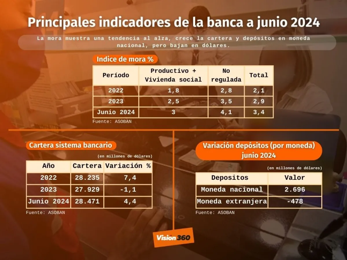 De acuerdo con Asoban, a junio de 2024, la cartera en mora alcanzó a 971 millones de dólares. En relación al índice de morosidad, se situó en 3,4%, manteniendo la tendencia al alza que proviene principalmente de la mora reprogramada.