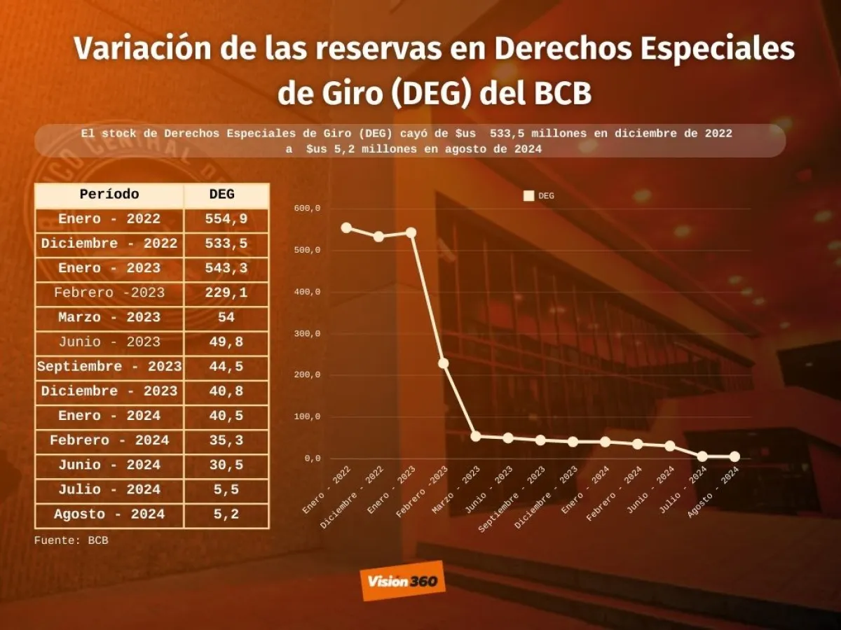 En diciembre de 2022, Bolivia tenía reservas en Derechos Especiales de Giro (DEG), equivalentes a 533,5 millones de dólares, pero en agosto de este año sólo queda un equivalente a 5,2 millones de dólares, una caída de 99,03%, según datos del Banco Central de Bolivia (BCB). El Ente Emisor admite que se usaron para pagar deuda y otras obligaciones.