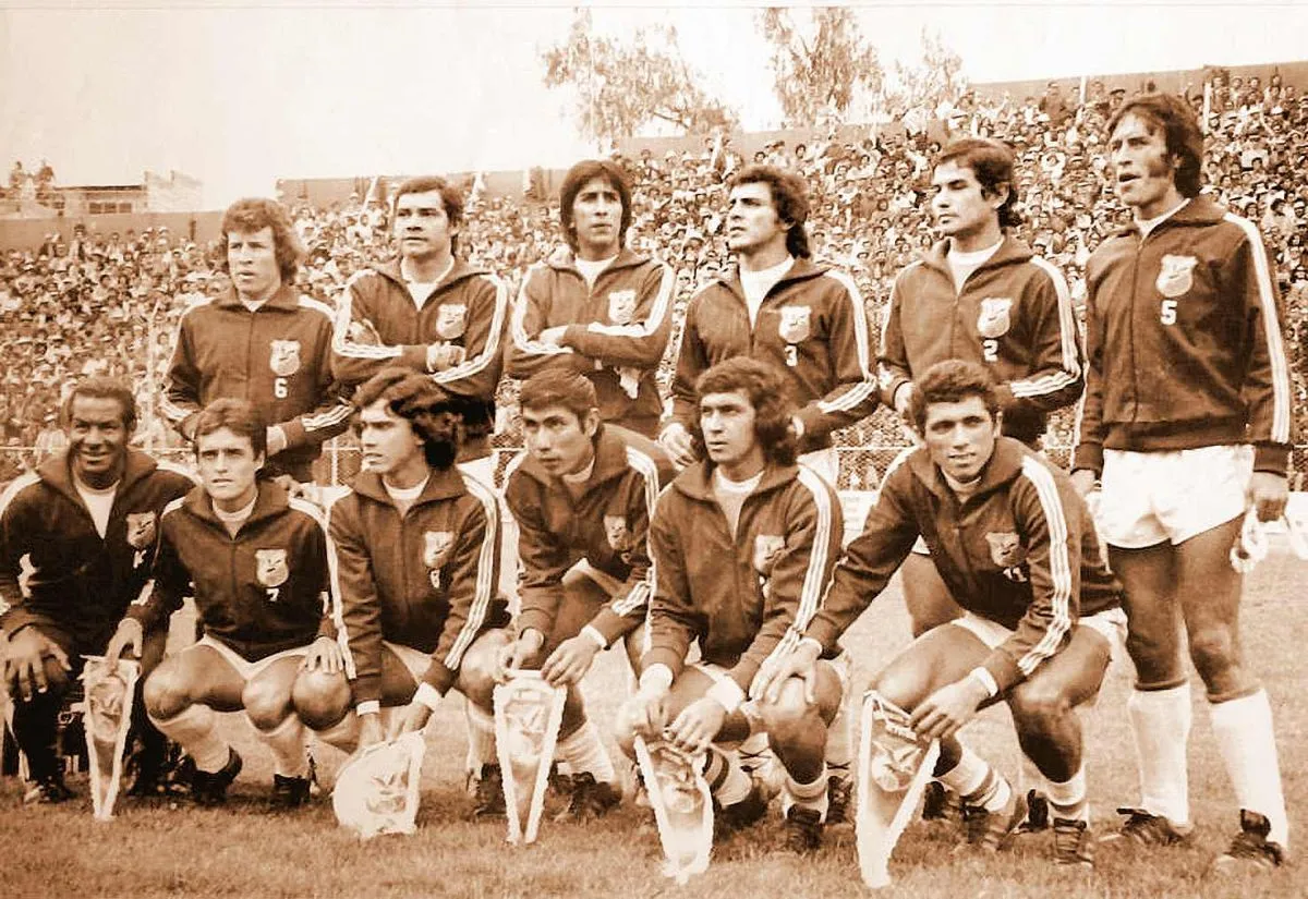 La histórica selección de 1977, antes de enfrentar a Uruguay en el estadio Simón Bolívar de Tembladerani. Foto: Colección Julio Mamani
