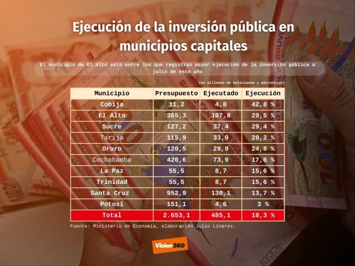 Un análisis del economista Julio Linares, con base a cifras del Ministerio de Economía, da cuenta de que en general los nueve gobiernos autónomos municipales capitales y El Alto tienen un presupuesto de inversión pública de 2.653,1 millones de bolivianos, y que el gasto global fue de 18,3% en los primeros siete meses del año.