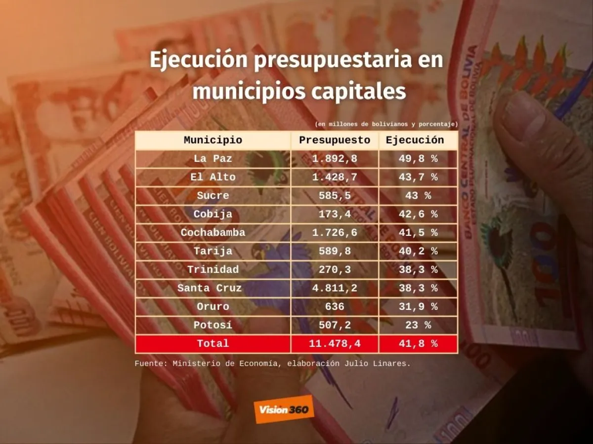 En el caso del gasto, de los 11.478,4 millones de bolivianos que tienen asignados los 10 municipios citados, hasta julio, se ejecutaron 4.792,7 millones de bolivianos, es decir un 41,8%, revela el análisis de Linares.