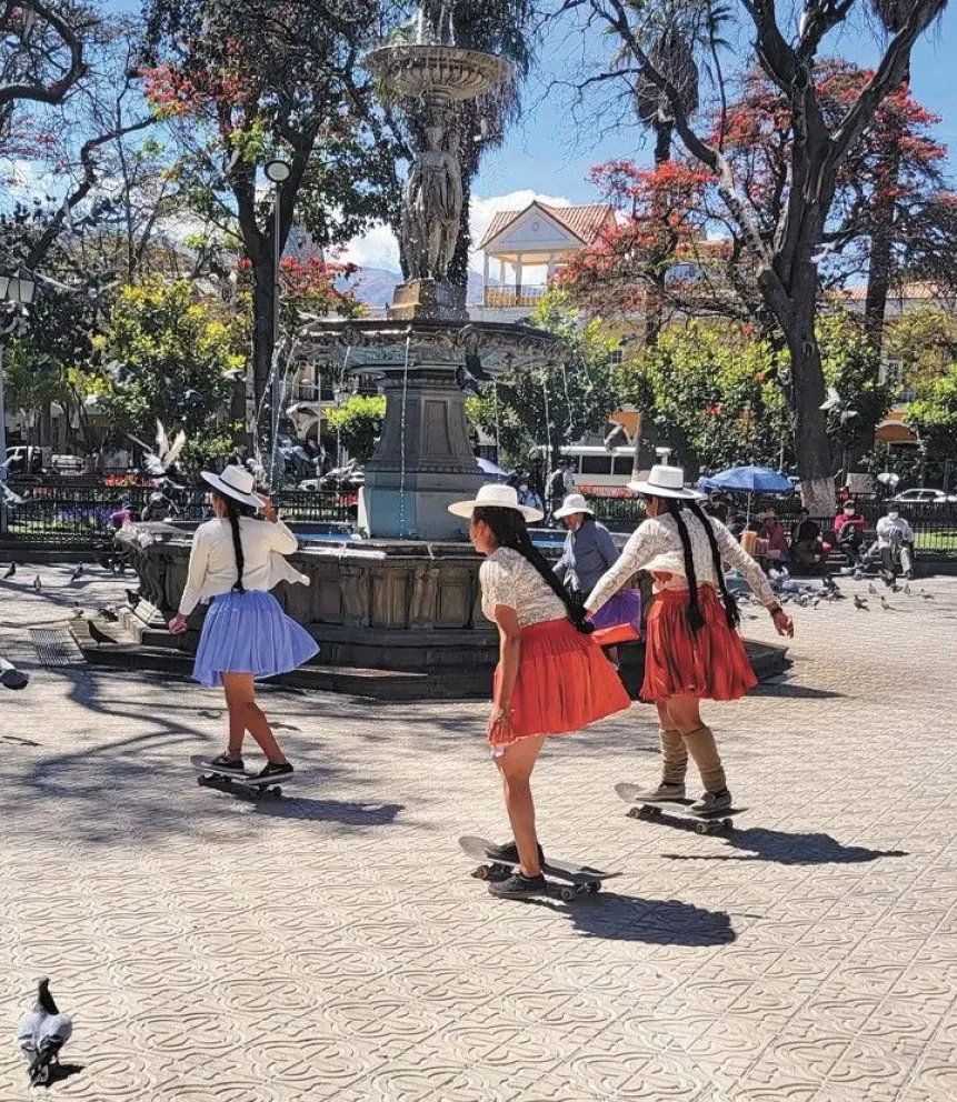 Allí, donde hace 112 años las mujeres vallunas se enfrentaron a las fuerzas realistas, este grupo de mujeres desafía los estereotipos sobre las tablas de las patinetas,  ataviadas con las prendas tradicionales de la chola cochala, incluyendo el voluminoso sombrero blanco de copa alta.