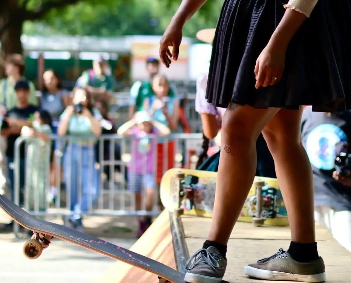 El sonido de las ruedas raspando el cemento se une al frus, frus de las polleras que revolotean mientras que las Imillas Skaters  realizan sus acrobacias sobre las patinetas.