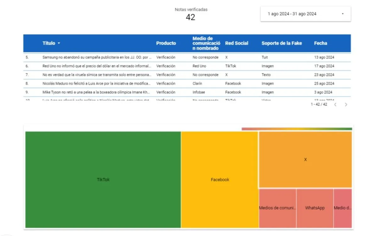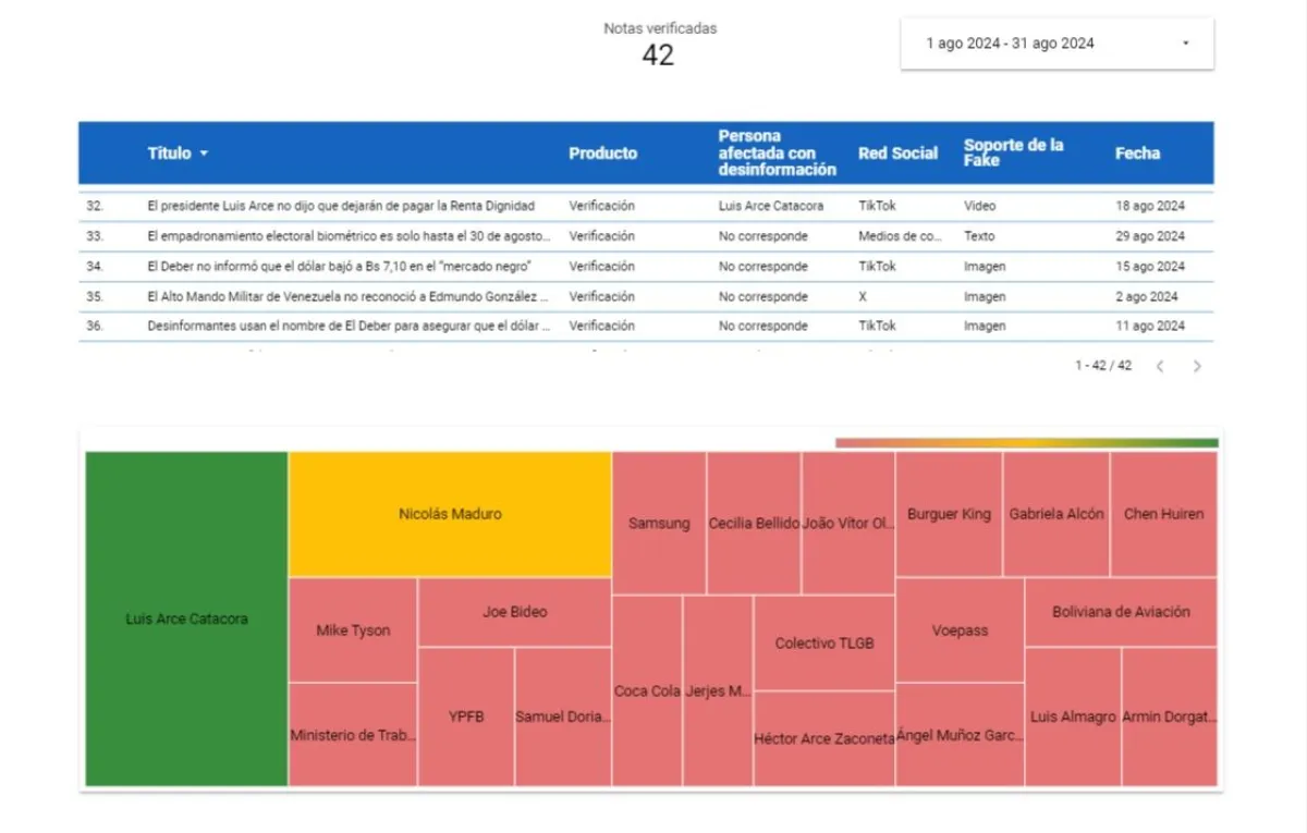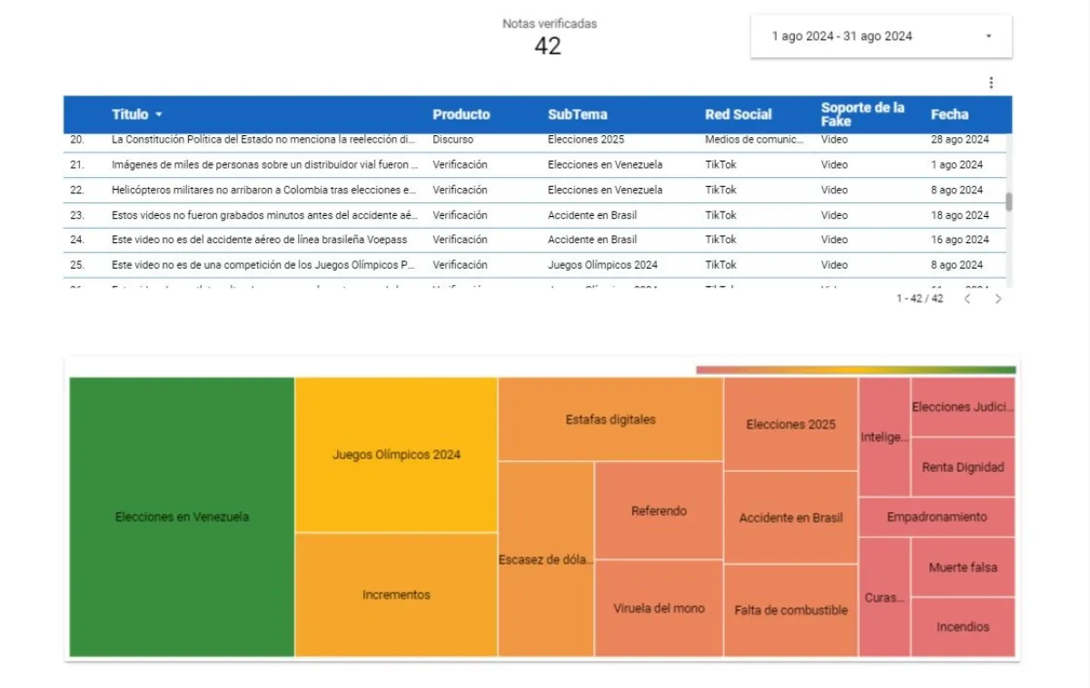 Del 1 al 31 de agosto de 2024, el equipo de Bolivia Verifica elaboró un total de 42 verificaciones: 36 contenidos desinformantes y seis (6) discursos públicos compartidos por figuras políticas. Los temas en los que se centró la desinformación fueron las elecciones presidenciales en Venezuela, que se desarrollaron a finales de julio, y los Juegos Olímpicos París 2024.