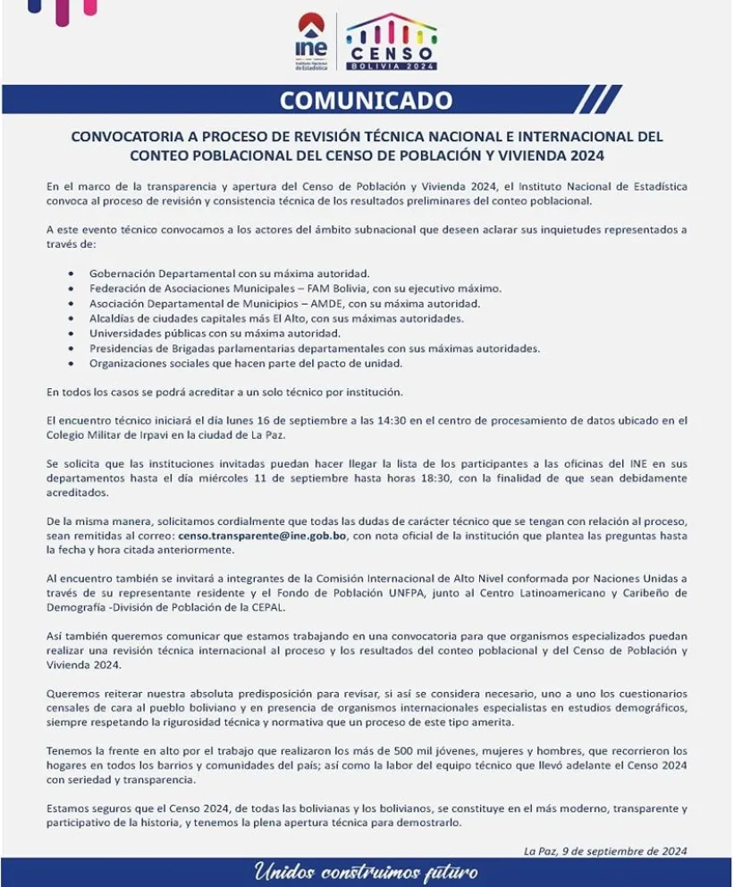 Este lunes, el director del INE, Humberto Arandia, convocó a gobernadores, alcaldes de ciudades capitales más El Alto, Pacto de Unidad, universidades, brigadas parlamentarias, Federación de Asociaciones Municipales (FAM-Bolivia) y Asociación Departamental de Municipios (AMDE) a una reunión técnica el próximo 16 de septiembre en la ciudad de La Paz.