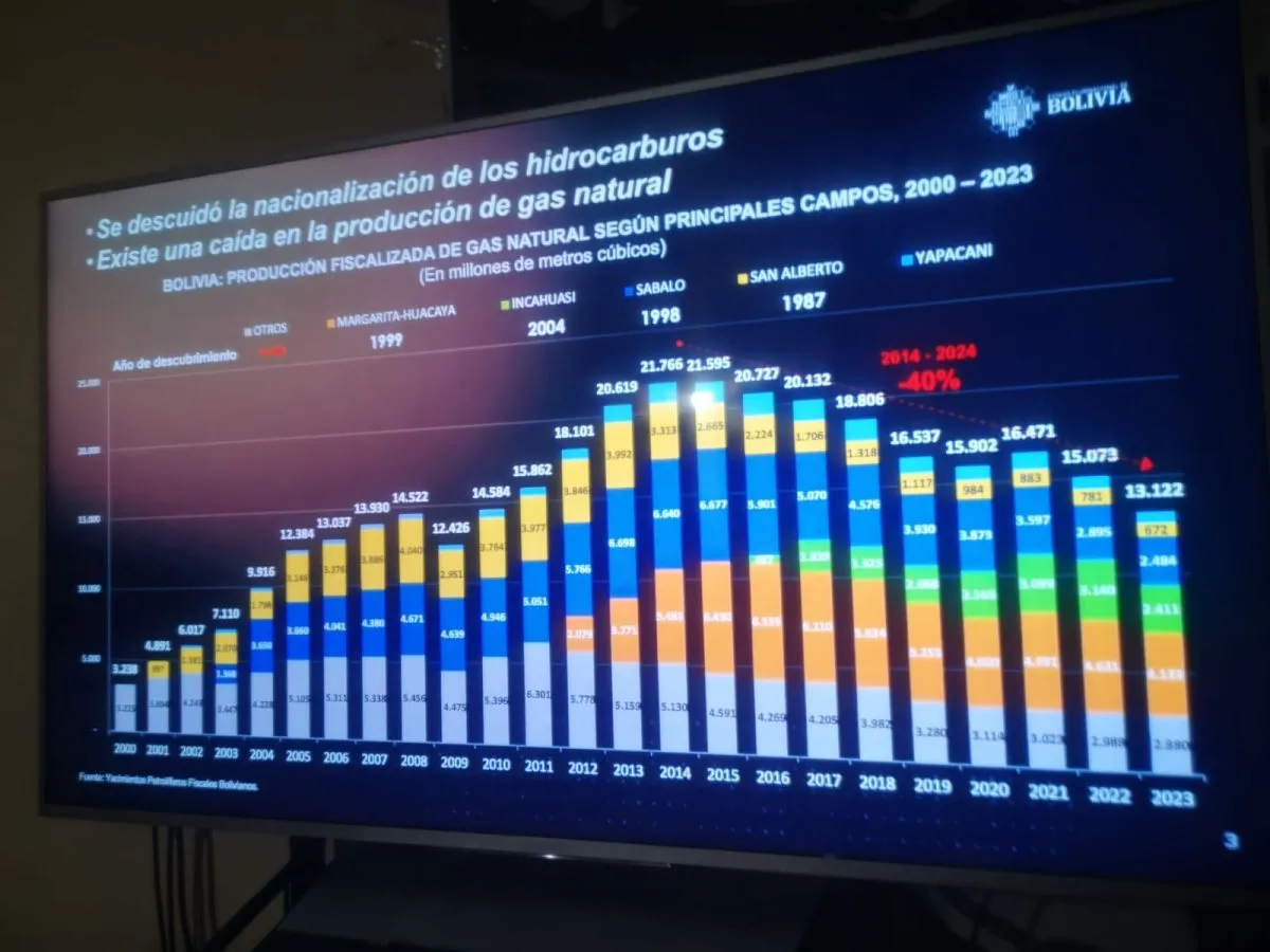 “Esta es la historia de todos los campos petroleros. También tenemos aquí Margarita, Huacaya, que tuvo su mejor producción hacia 2016, generaba 6.559 millones de metros cúbicos este campo y ahora 4.000. Está en descenso”, puntualizó.