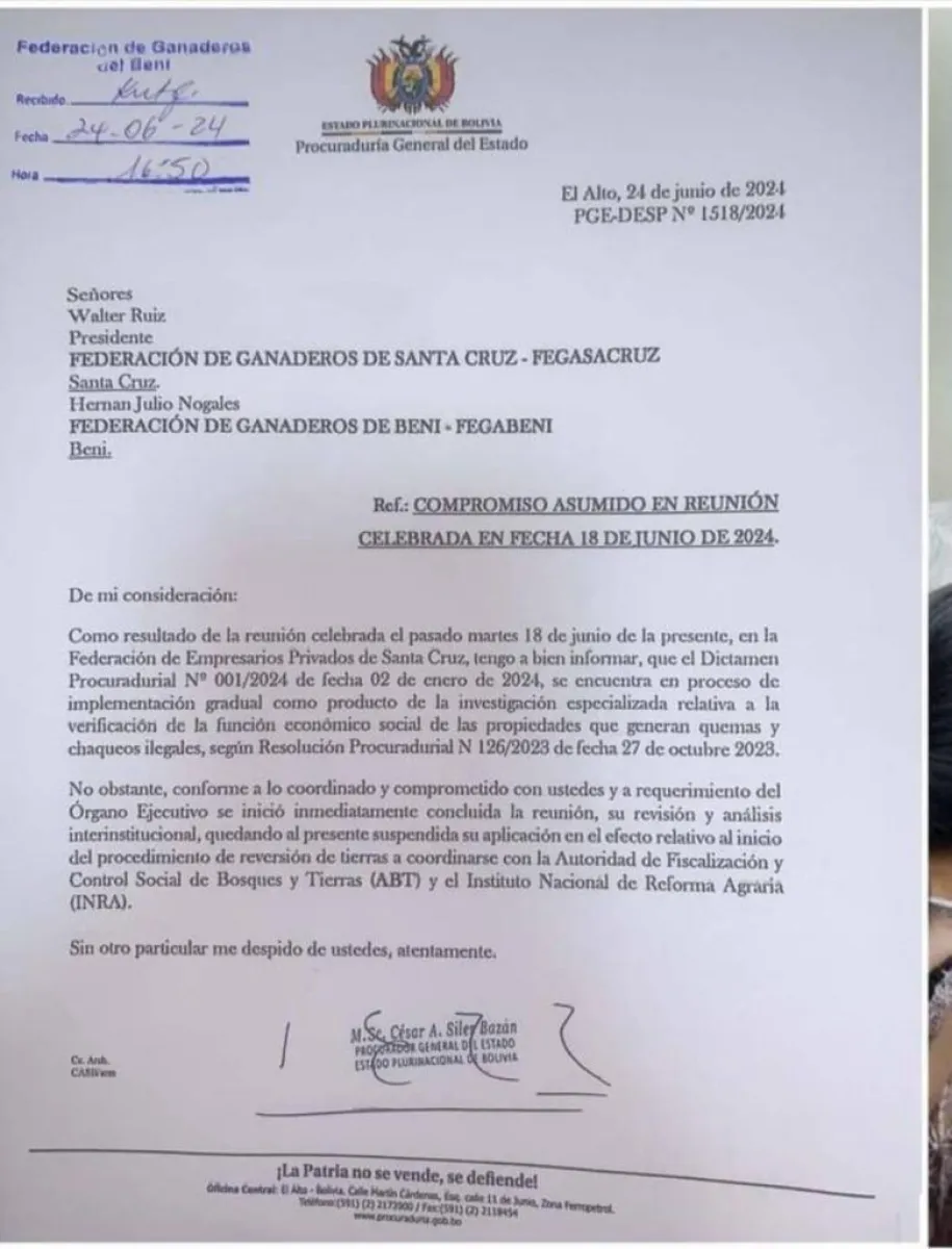 No obstante, la carta, dirigida a Walter Ruiz, presidente de Fegasacruz, y a Hernán Julio Nogales, presidente de Fegabeni, fechada el 24 de junio, hace referencia a la reunión celebrada el 18 de junio de este año con los ganaderos. Esta misiva fue publicada por Sumando Voces.