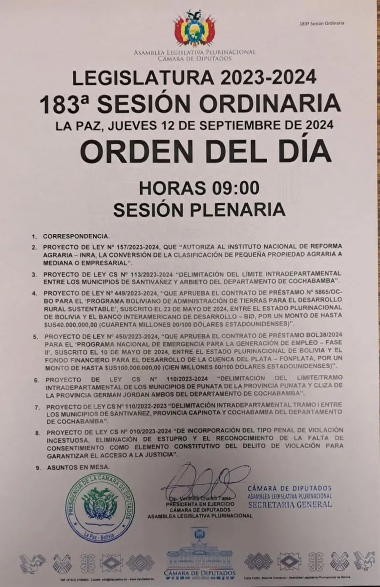 La convocatoria fue lanzada por la diputada Verónica Challco, quien es la presidenta en ejercicio de la Cámara Baja. La sesión está prevista para las 9.00.