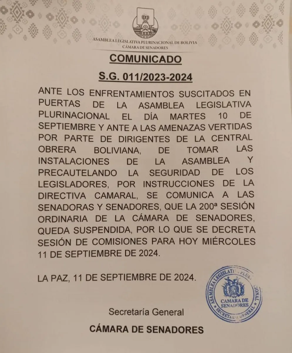 “Ante los enfrentamientos suscitados en puertas de la ALP, el día martes 10 de septiembre, y ante a las amenazas vertidas por parte de dirigentes de la Central Obrera Boliviana, de tomar las instalaciones de la Asamblea y precautelando la seguridad de los legisladores, por instrucciones de la directiva camaral, se comunica a las senadoras y senadores, que la 200ª sesión ordinaria de la cámara de senadores, queda suspendida, por lo que se decreta sesión de comisiones para hoy miércoles 11 de septiembre de 2024”, señala el Legislativo, en un comunicado emitido por la secretaría general.