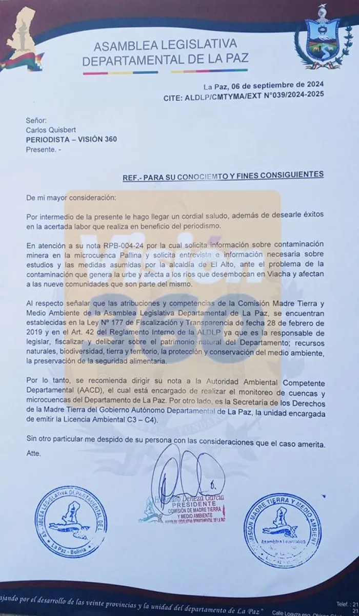 La Comisión de la Asamblea Legislativa Departamental de La Paz, Madre Tierra y Medioambiente, demoró 57 días en responder a un requerimiento de información y entrevista solicitados a los responsables por Visión 360, sobre la contaminación del río Pallina y las fuentes de agua en el municipio de Viacha. Sin embargo, en una nota de respuesta del asambleísta Arturo Deheza, señala no ser la entidad competente para informar sobre el tema.