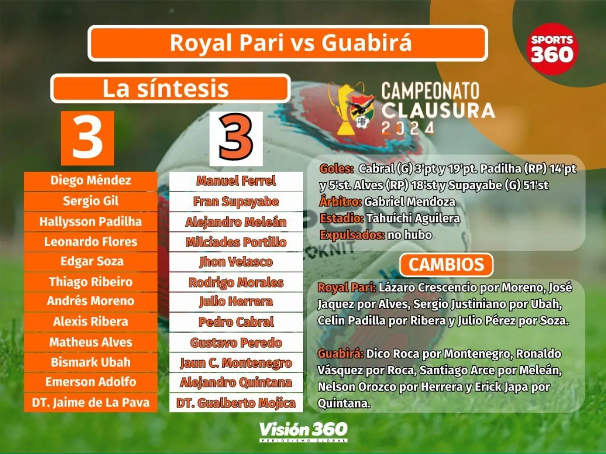 Guabirá empató 3-3 con Royal Pari en el sexto minuto de adición de un encuentro que lo tuvo controlado, luego lo perdía y al final terminó igualándolo. El juego se disputó en el estadio Tahuichi Aguilera, por la fecha 14 del torneo Clausura de la División Profesional.