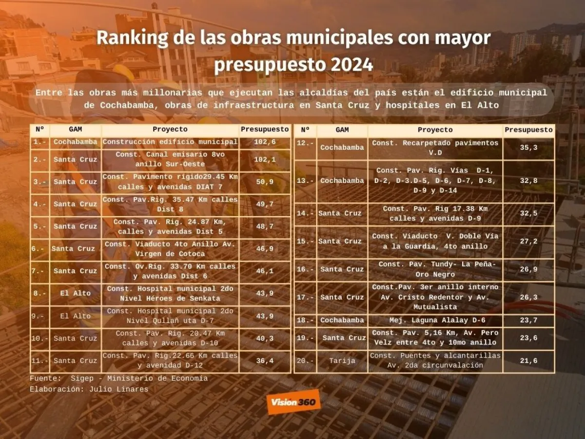 La construcción del edificio municipal en Cochabamba cuesta Bs 102 millones, mientras que la segunda obra con más inversión es impulsada por el alcalde de Santa Cruz, Jhonny Fernández con la construcción del canal Emisario en el octavo anillo Sur-Oeste con un monto de Bs 102,1 millones. Eva Copa ejecuta dos hospitales, cada uno con una inversión de Bs 43,9 millones.