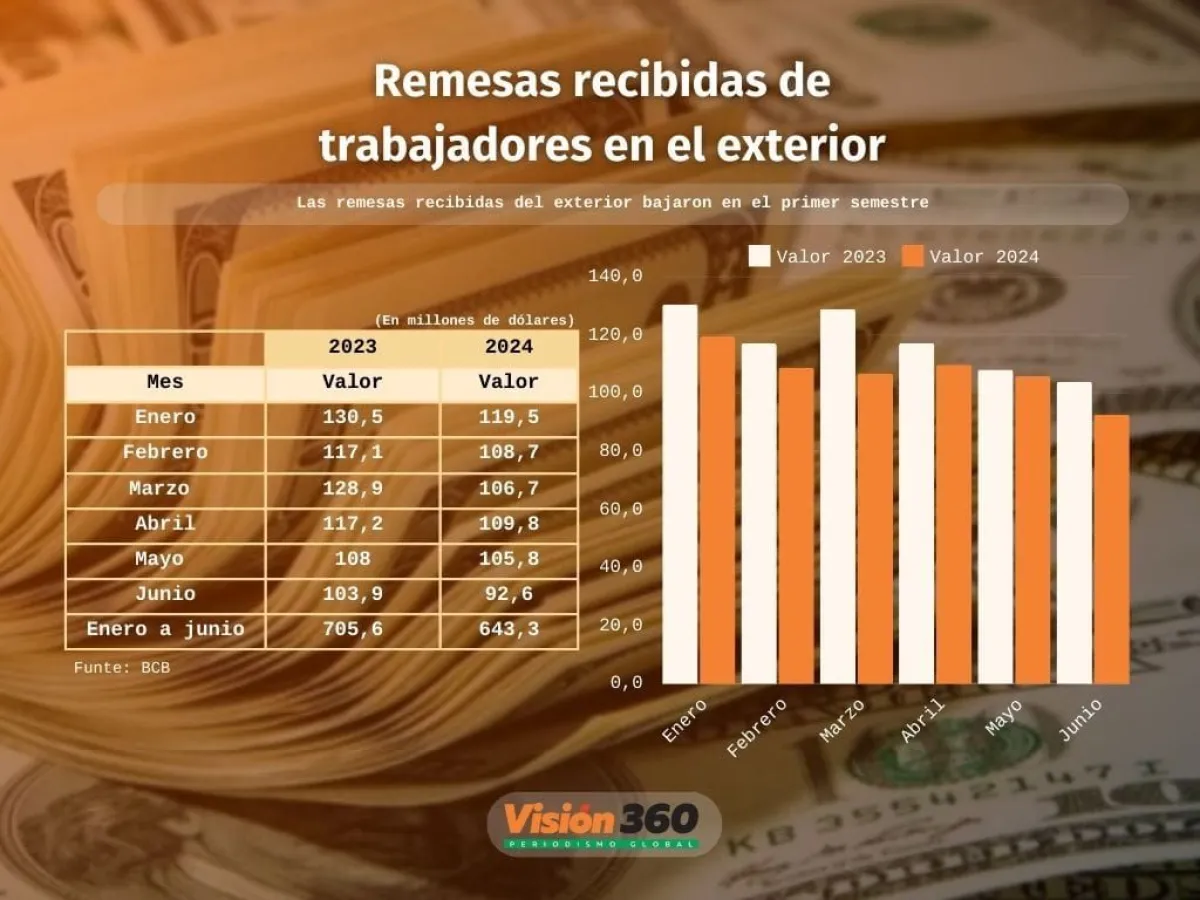 Datos del Banco Central de Bolivia (BCB), del primer semestre del año 2023, señalan que Bolivia recibió remesas por un valor de 705,6 millones de dólares, sin embargo, en los primeros seis meses de este año, el envío bajó a 643,3 millones de dólares, es decir 62,3 millones de dólares menos.