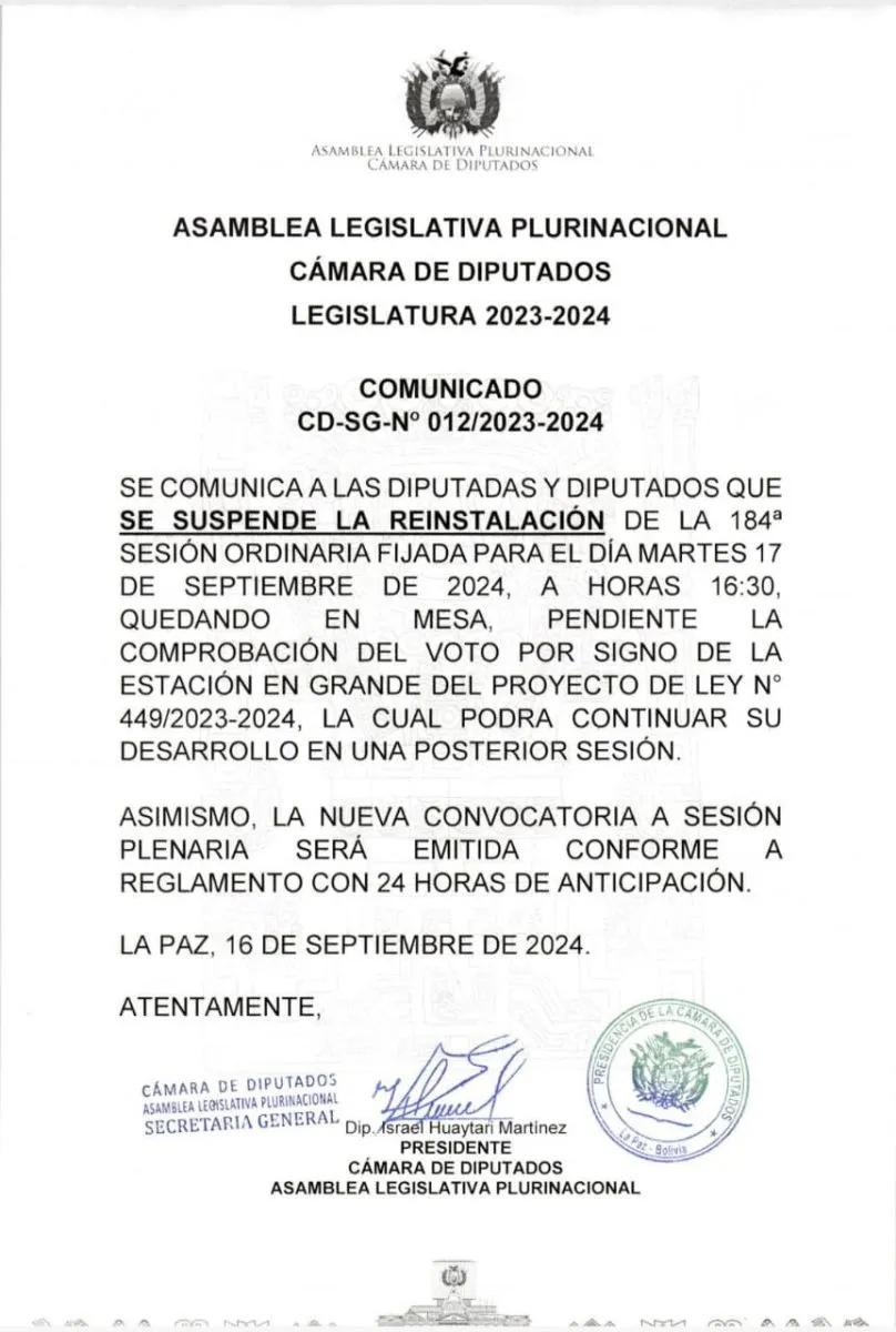 En un comunicado, la Asamblea Legislativa Plurinacional (ALP) informó: “Queda en mesa, pendiente la comprobación del voto por signo de la estación en grande del proyecto de ley N° 449/2023-2024, la cual podrá continuar su desarrollo en una posterior sesión; asimismo, la nueva convocatoria a sesión plenaria será emitida conforme reglamento con 24 horas de anticipación”.