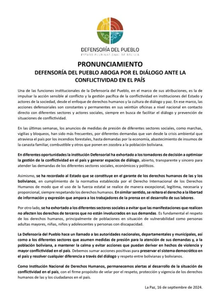 “La Defensoría del Pueblo hace un llamado a las autoridades nacionales, departamentales y municipales, así como a los diferentes sectores que asumen medidas de presión para la atención de sus demandas y, a la población boliviana, a mantener la calma y evitar acciones que puedan derivar en hechos de violencia y mayor conflictividad en el país”, indica el documento.