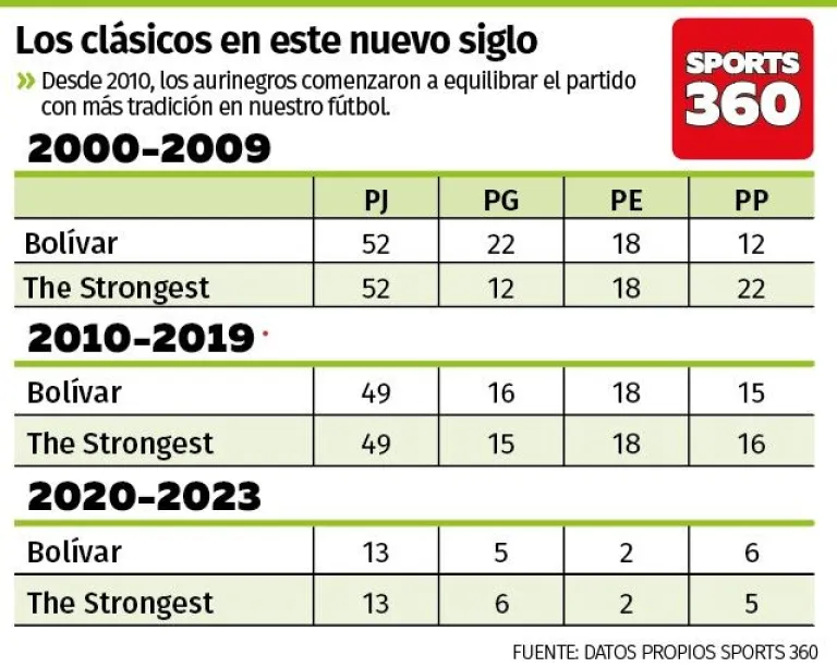En la primera década de este siglo (2000-2009), Bolívar volvió a tener supremacía sobre The Strongest al anotarse 22 triunfos sobre 12 del cuadro de Achumani.