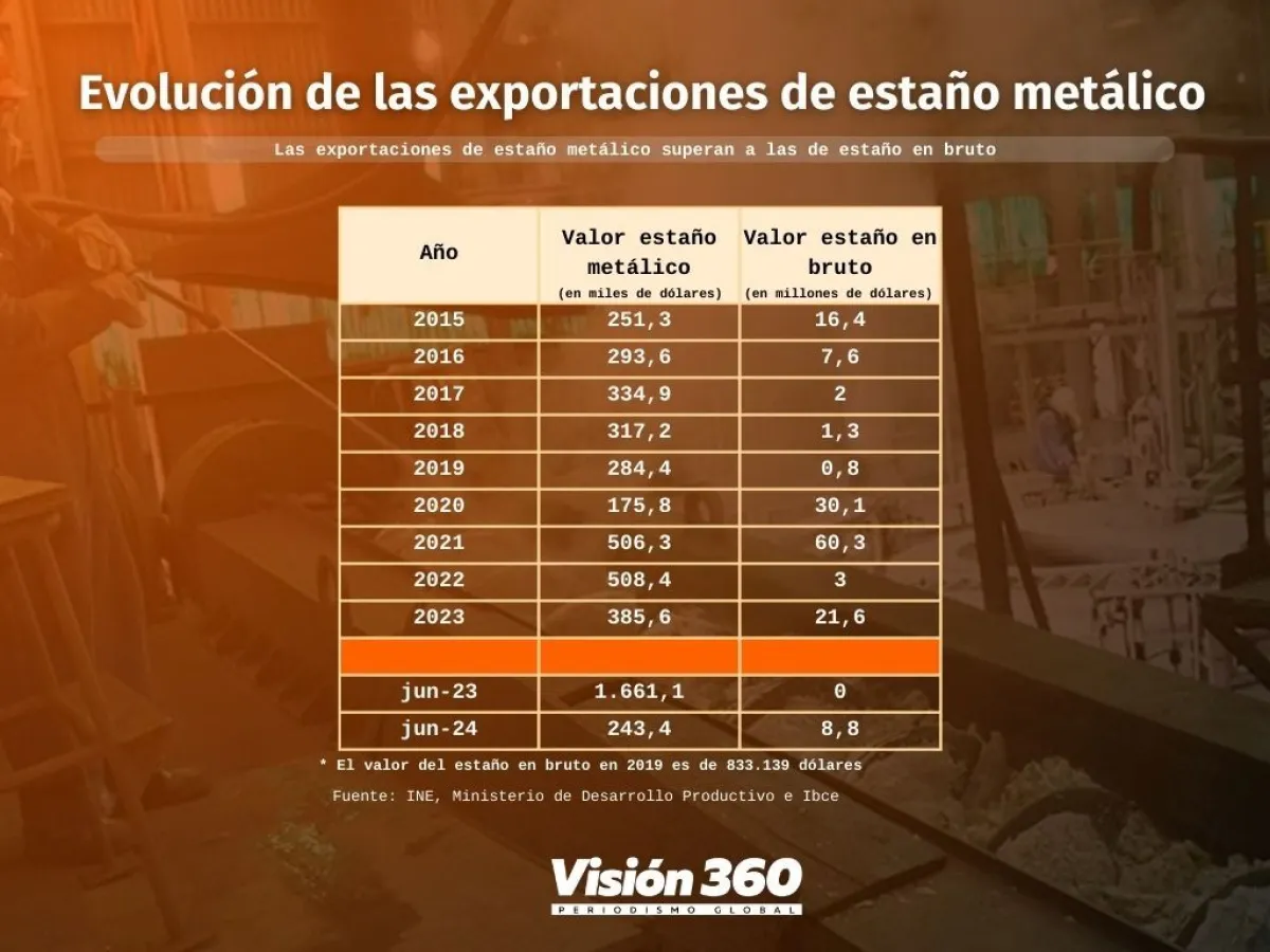 Bolivia es uno de los principales productores de este metal en el mundo, pero, desde hace varios años, las exportaciones de estaño metálico superan a las de estaño en bruto. En el primer semestre las ventas llegaron a 244,2 millones de dólares, un 43,7% más que en 2023, según datos del Instituto Nacional de Estadística (INE).