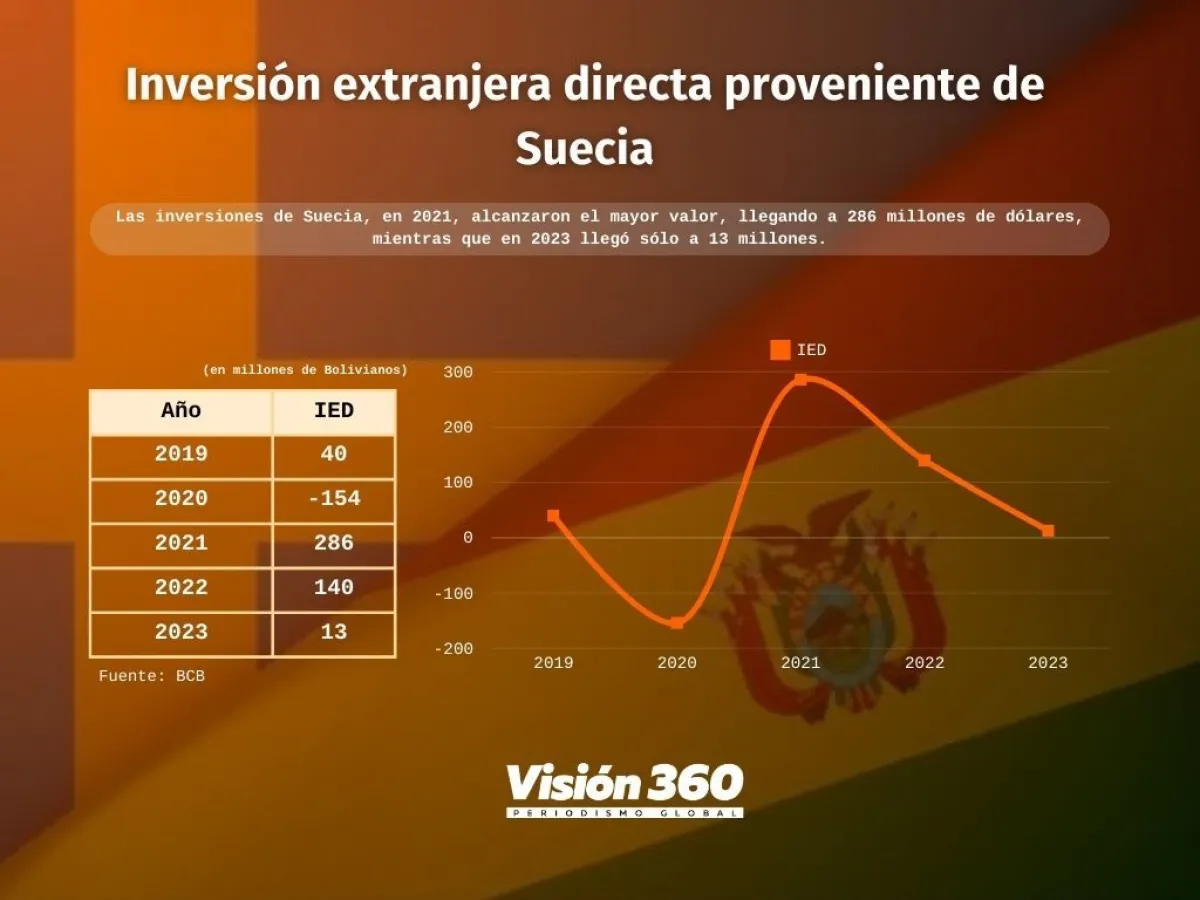 Según datos del Banco Central de Bolivia (BCB), la inversión de Suecia en Bolivia en 2022 alcanzó un valor de 140 millones de dólares, en 2021 de 286 millones de dólares y el año pasado disminuyó a 13 millones de dólares.