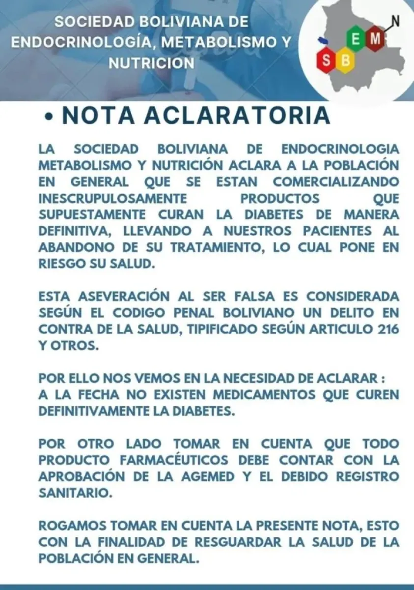 La Sociedad Boliviana de Endocrinología, Metabolismo y Nutrición lanzó a mediados de julio una advertencia ante la proliferación de estos llamados “medicamentos milagrosos”. En su comunicado, los especialistas en salud subrayaron que ningún fármaco puede curar definitivamente la diabetes. Alertaron que reemplazar tratamientos médicos avalados por estas píldoras no solo es inútil, sino potencialmente peligroso.