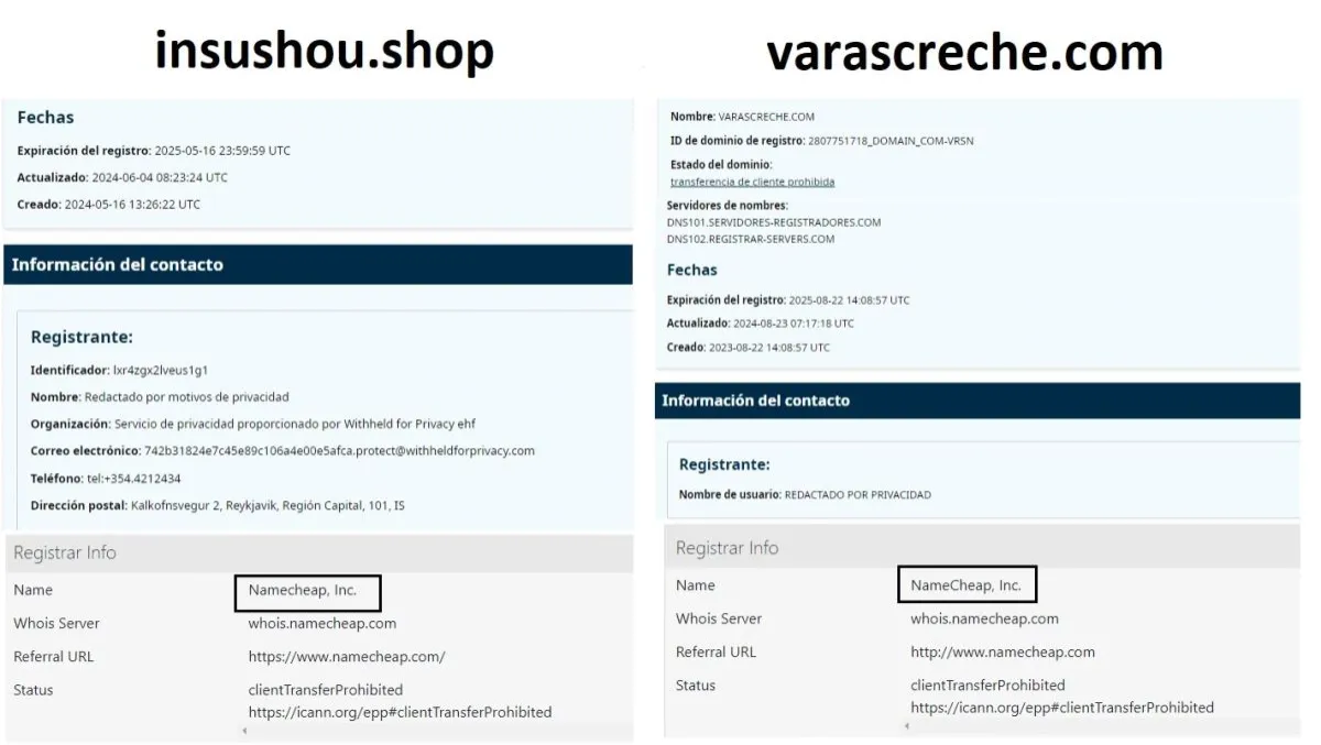 Utilizando herramientas de inteligencia de fuentes abiertas se detectó que dos de estos portales fueron creados por la empresa Namecheap. Inc; del resto no se encontró información.