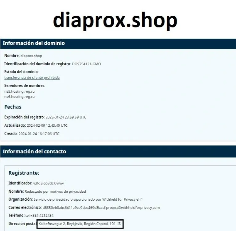 Un ejemplo de este problema es el sitio web diaprox.shop, que asegura vender Diaprox en Bolivia. Al analizarlo, se descubrió que su información está restringida, lo que impide conocer a los responsables detrás del dominio.
