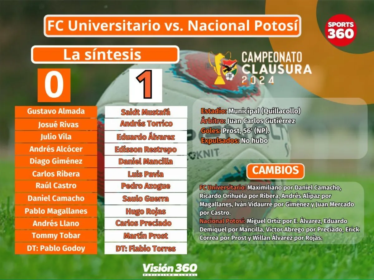 Nacional Potosí se reivindicó de la derrota de hace una semana con Aurora (1-3) como sueño de casa y en la tarde de este viernes se impuso a domicilio a FC Universitario (0-1), partido con el que se inauguró la jornada 15, última de la primera rueda, del torneo Clausura de la División Profesional.