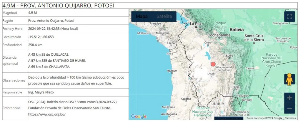 El Observatorio de San Calixto reportó este domingo un sismo de magnitud 4.9 en la provincia Antonio Quijarro del departamento de Potosí.