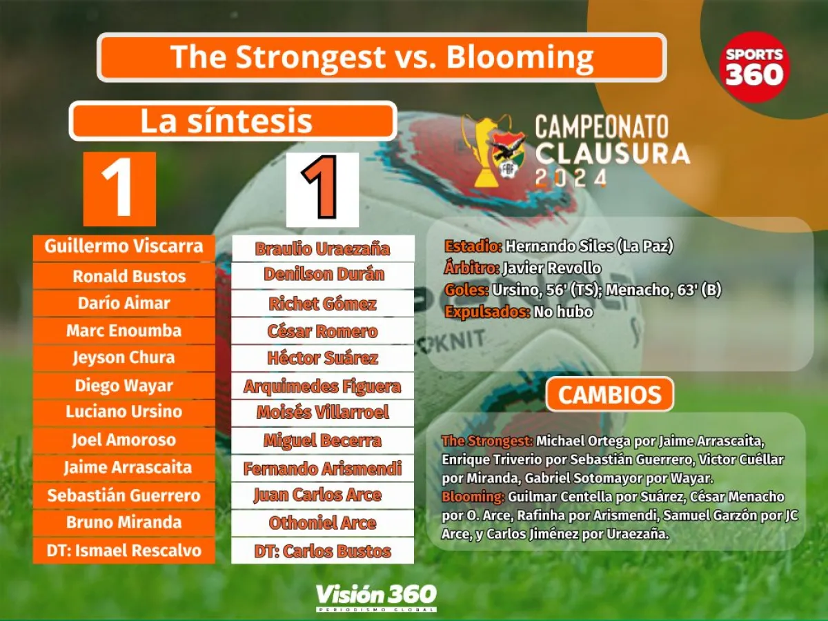 The Strongest chocó con una muralla presentada por Blooming y no pasó del empate 1-1 este domingo en el estadio Hernando Siles, por la decimoquinta jornada del Torneo Clausura de la División Profesional.