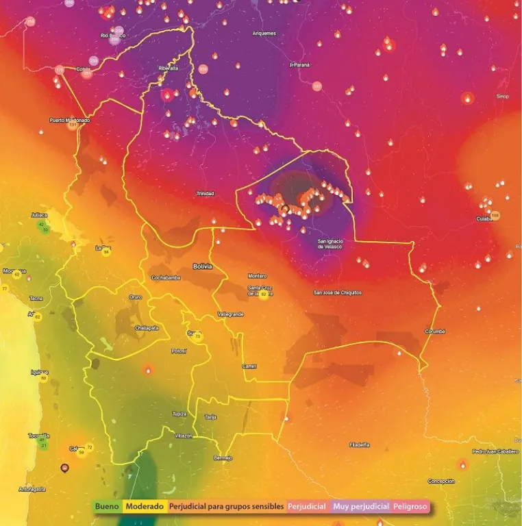 IQAir es una empresa tecnológica suiza que permite a particulares, organizaciones y gobiernos de todo el mundo, monitorear la calidad del aire con base en información de instancias oficiales. Por ello, su mapa confirma los datos del Gobierno Departamental de Santa Cruz, que señala que, en el municipio de San Ignacio de Velasco, la contaminación por los incendios es tan grave que incluso pasa de la clasificación de “peligroso”.