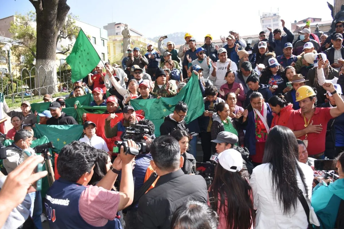 “El pacto de unidad, con todas sus organizaciones estamos aquí pacíficamente para defender la democracia y resguardar nuestra Casa Grande; todas las organizaciones a nivel departamental nos hemos trasladado hasta aquí para hacer respetar la Constitución; esa marcha está viniendo al golpear”, denunció el dirigente de la Csutcb “arcista”, Lucio Quispe.