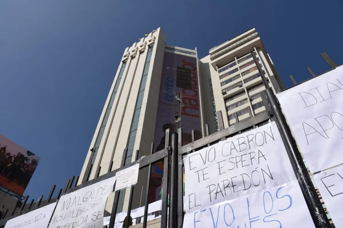 Los mensajes contra Morales en el frontis del edificio. Foto: APG