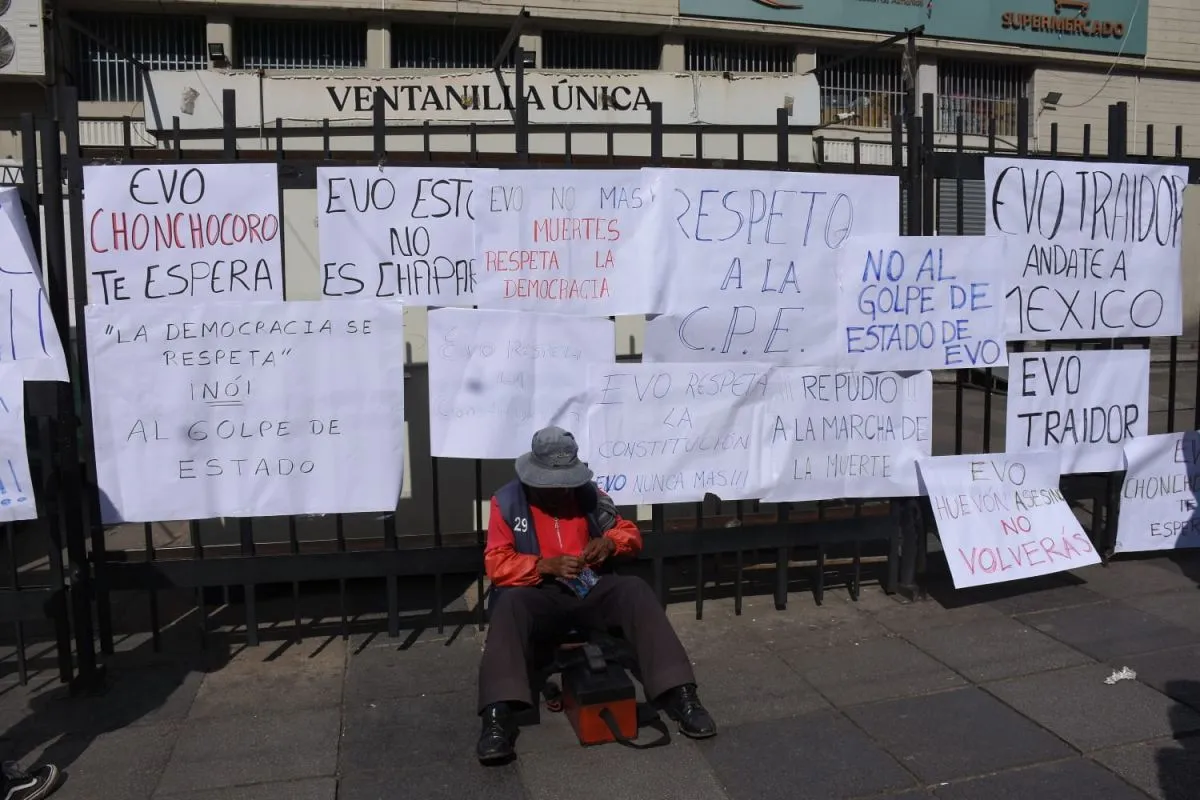 “Evo, no más muertes, respeta la democracia”; “No al golpe de Estado de Evo”; “Repudio a la marcha de la muerte”; “Evo traidor, ándate a México”; o “Evo, Chonchocoro te espera”, son los mensajes que se lee en los carteles, escritos a pulso con marcador sobre cartulinas.